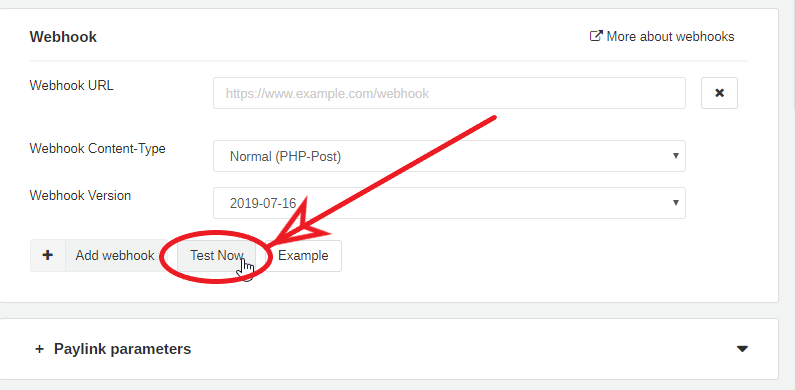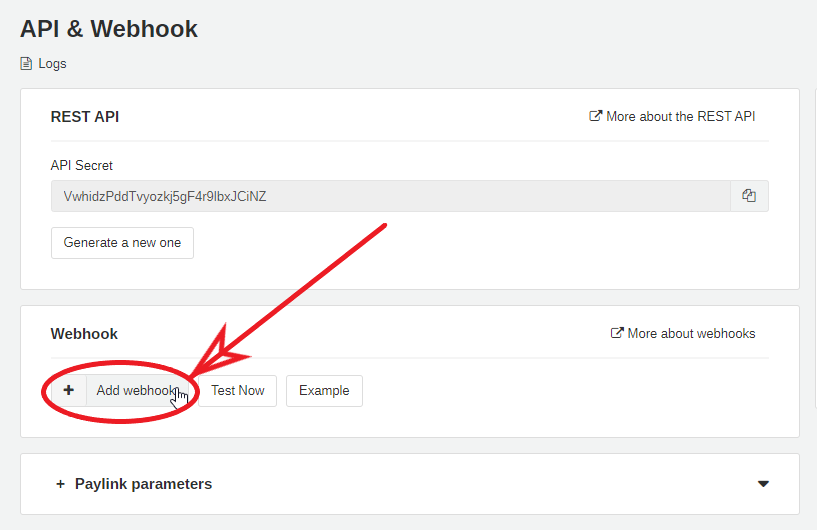 Now you have to switch back to your Payrexx account and again to API & Webhook. Create a new webhook there by selecting the "Add webhook" button. Add a new webhook.